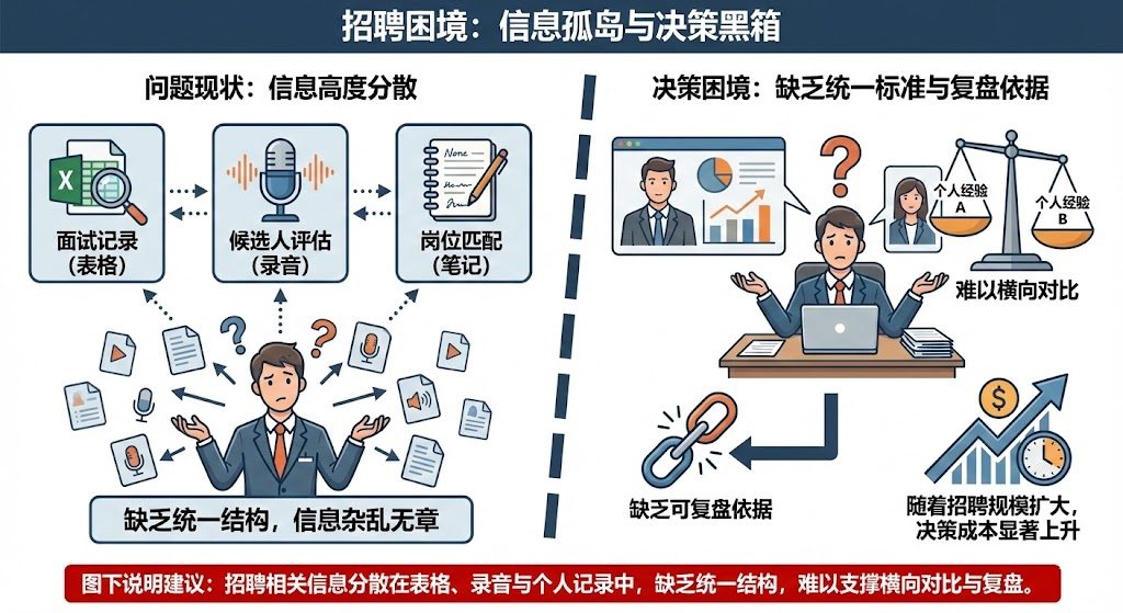 核心问题:招聘决策依赖个人经验,信息分散、不可对比、不可复盘