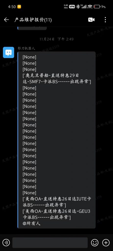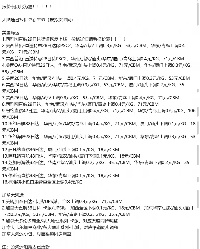 在实际业务中,报价维护涉及多个系统并行运转,包括 天图、安速、心一、小包 等平台。各系统的报价人员会根据市场行情及关税政策变化,发布最新报价公告。该更新具有 不固定但极高频率 的特点,在关税或市场波动较大的阶段,一周内至少更新四次并不少见。