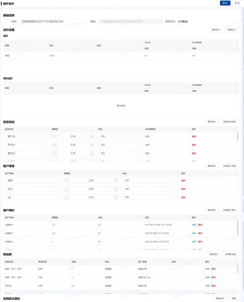 以天图系统为例,单次报价更新通常涉及 数百个渠道。除基础价格变动外,还需要根据市场行情调整优惠价格,并在新增仓库或渠道变更时,同步修改渠道相关的多项配置字段,例如运输方式、清关方式、派送方式、计费规则等。