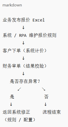 报价异常由“财务事后发现”前移至“订单生成阶段自动识别”,显著降低跨部门沟通成本,并使自动化流程首次对最终结果负责。本文记录了该 RPA 项目从单点自动化到流程闭环的设计与演进过程,重点不在于具体工具实现,而在于业务逻辑与控制点的重构思路。